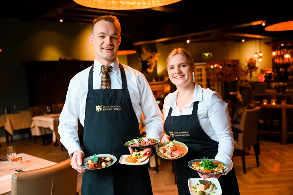 Je rijdt de poort binnen van Het Wapen van Beckum en ziet een imposant Saksisch gebouw voor je. Nadat je de auto of je fiets hebt geparkeerd loop je via de moderne entree naar binnen. In de gang word je begroet door Nick, die je vriendelijk welkom heet. Hij neemt je jas aan en neemt je vervolgens mee naar het restaurant, waar de ambiance een balans is tussen traditioneel en hip. Op de tafels liggen tafelkleden en het visgraat vloertje voegt een eigentijds tintje toe aan de ruimte.